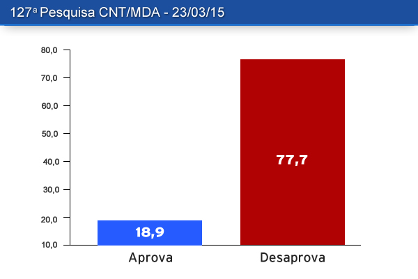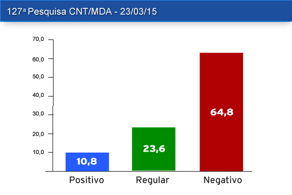 A 127ª Pesquisa CNT/MDA demonstra forte pessimismo do brasileiro em relação aos governos, principalmente ao governo federal. Os resultados mostram queda expressiva da popularidade da presidente Dilma Rousseff e da avaliação do governo, em consequência, principalmente, da piora da situação econômica, do aumento da inflação e do custo de vida, do risco de desemprego, da piora nos serviços públicos e da corrupção, que passa a ser relacionada fortemente ao  governo e à presidente da República.